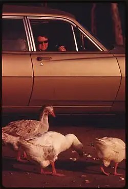 Motorists feed birds at Buena Vista Lagoon, 1975. Photo by Charles O'Rear.
