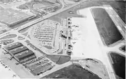 Buffalo Niagara International Airport opened as Buffalo Municipal Airport in 1926 on former farmland, making it one of the country's oldest public airports. The original airport included a small terminal building, one hangar, and four cinder runways, each 3,000 feet (910 m) long by 100 feet (30 m) wide. Passenger and mail service began in December 1927, with service to Cleveland. A WPA-built Art Deco V-shaped terminal with a large cylindrical tower opened in 1939, replacing the original terminal. At this time, the airport had four paved runways: Runway 5/23 was 5,630 feet (1,720 m) long, Runway 13/31 (now 14/32) was 5,730 feet (1,750 m) long, Runway 1/19 was 5,000 feet (1,500 m) long, and Runway 8/26 was 3,650 feet (1,110 m) long. All of the runways were 150 feet (46 m) wide.[5] Runways 1–19 and 8–26 were closed in the 1950s, and Runway 13–31 was renamed Runway 14–32.