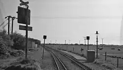 Officially opened on 16 July 1927, this station was then called Burmarsh for East Dymchurch and was equipped with two platforms, a booking office, a waiting room, and possibly a signal box (historical accounts vary on this last point, most suggesting the booking office housed a lever frame controlling just two signals). Later the station name was changed to Dymchurch Bay. Traffic levels fell sharply after the Second World War, and the station was eventually reduced in status to a halt and again renamed as Burmarsh Road Halt. It closed in 1948, re-opened in 1950, but finally closed again at the end of that same year, when the station buildings were demolished. The roof of the booking office was left in situ, on pillars (with the walls removed), to form a waiting shelter in the event of re-opening, but this structure was also demolished a few years later. However, the station was again re-opened on 7 September 1977 as the starting point of the school train service run for Kent County Council, transporting local children to Southlands Comprehensive School in New Romney. Declining use meant that the school train last ran on 24 July 2015.[1]