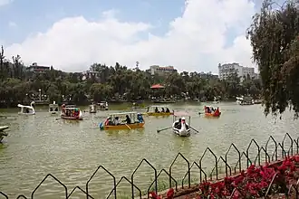 Burnham Lake, formerly known as the City Pond,[19] is about a century-old man-made lake situated at the center portion of Burnham Park. In early 2013, it underwent dredging which saw the removal of a meter (3.28 feet) thick silt sitting on the lake's bed. It was also dredged in 1994. After the 2013 dredging, the lake's volume is 34,000 cubic meters (1,200,000 cu ft).[20] The depth of the body of water is about 3.04 meters (10.0 ft). Boat rentals are available in the lake catering to tourists and residents.[21]