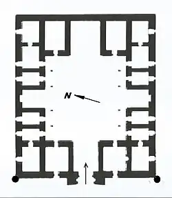 There are porches of about 1.10 m (3 ft 7 in) width on two sides of the courtyard.[3][4][6] The pointed arches of the porches are carried by 270 cm (110 in) high round columns of nearly 45 cm (18 in) diameter.[3][4][6] It is assumed that the columns were gathered for reuse because some of the column capitals are of Corinthian order, some of them bear Byzantine monograms. There are no porches at the main gate's courtyard side iwan and at the iwan across from the main gate.[4]