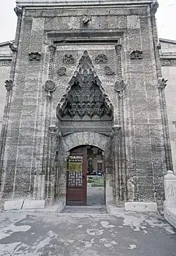 The architect of the medrese building is not known.[3][5] The building is designed in the form of old Turkic medreses in Central Asia. It has a near-quadrat plan.[2][3][4] Its architecture has the most regular symmetry among the medreses in Anatolia. It is constructed in a ground floor and aa mezzanine, with four iwans around an open courtyard.[1][3][4] The main facade wall is built in ashlar.[3][6] The side walls are of partly ashlar and rubble masonry, while the backside wall is also of rubble masonry.[6] Also bricks gathered are used in the building.[2] The building's walls are 115–150 cm (45–59 in) thick depending on their position.[6] The main iwan, which resembles a lacework with the patterns of its muqarnas,[2][3] has the dimensions 6.50 m × 7.80 m (21.3 ft × 25.6 ft).[6] The outflow crown gate is flanked by two muqarnas windows and two grooved towers in the corners.[1][2] The portal's iwan is surrounded by inscriptions. Its mquarnas is decorated with geometric figures.[4] The domed room behind the window at right of the main gate conyains a mihrab, and it is assumed that the room was used as a masjid. The room behind the left window in the facade is reserved for the tomb,[3][4] which contains the sarcophagi of the endower and his children.[2] The entire walls of the tomb were initially covered with rich hexagonal tiles in blue and black. The tiles on the walls survived partly today.[2][3][4] The endower's full name is written in an inscription belt running around at the top of the tomb room walls, just below the lines of tile-covered muqarnases.[4]