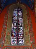 After the end of World War II, the new parish priest, Father Franciszek Hanelt proceeded to heal war damage and renovate the temple. In 1950, the Madonna and the Rose was moved for conservation to Nicolaus Copernicus University in Toruń.[7] The renovation of the stained glass was realized by Edward Kwiatkowski, lecturer at the Faculty of History and Art of Toruń and a student of Henryk Jackowski-Nostitz, who directed the polychromy of the church before the war, through his stained-glass studio "Polichromia" in Poznań: the technique followed was the one used in the 13th century on Gothic stained-glass windows of the Sainte-Chapelle in Paris.[8] Works at the church lasted from 1952 to 1954.[9]