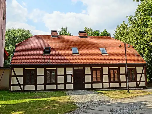 By the beginning of the 18th century, the building was almost ruined, despite the efforts of the town council to take over the totality of school's costs.[21] The building itself was used as a barn, and pupils transferred to a basic house erected on the eastern wall of the sacristy, furnished with benches and tiled stables.[22] During Prussian times, the actual building was erected (1834–1854) to meet the needs of the parish school, on the site of the older derelict edifice.[23]