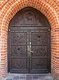 The temple has a Brick Gothic form,[11] with a closed chancel facing east, three naves and a square tower on the south. On the west side is a double-decker porch with arcades, which gives onto the main entrance to the church with the Renaissance oak door (17th century) decorated with Bydgoszcz's coat of arms and bearing the initials of city guilds and townsmen (1925).