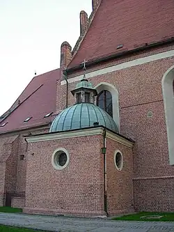 From 1466 to 1617, three quadrangular chapels were erected and attached to the main body, while a fourth chapel was built at the location of the former presbytery entrance. In 1559, a turret carrying a light bell cast by master Andrzej was set up at the edge of the nave roof; another bell was suspended there in 1668. In 1702, it was replaced by a Baroque turret, covered with bronze. It still stands today: it is octagonal and has a roof lantern. A new bell was ordered for this realization from bellfounder Absalom Wittwerck from Gdańsk.