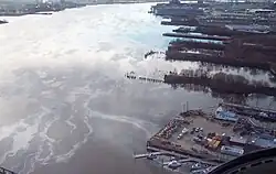 On November 26, 2004, the Athos I, a 750-foot (230 m) single-hull oil tanker carrying 13.3 million US gallons (50×106 L) of oil that had traveled from Venezuela was maneuvering to dock at a Citgo dock on the Delaware River near its refinery at Paulsboro. An anchor in the river's bed, known to have been there since at least 2001, caught on the ship's hull and tore a 6-foot (1.8 m) gash into it, releasing more than 260,000 US gallons (980,000 L) of oil into the river.[2] The spill spread downstream affecting the shoreline in more than three states (Pennsylvania, New Jersey, and Delaware), killing over 11,000 birds, temporarily shut down the Salem Nuclear Power Plant, and halted commercial use of the river for several weeks during cleanup efforts.[3][4] At the time, it was considered the second worst oil spill in the United States following the Exxon Valdez oil spill, with cleanup costs over US$267 million.[5] The spill led to passage of the Coast Guard and Maritime Transportation Act of 2006 which among provisions, tripled fines resulting from oil spills from single-hulled vessels to encourage double-hull use, as well as requiring those with knowledge of obstructions in waterways to inform the Coast Guard for immediate removal.[5]