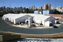 In the city of São Paulo, field hospitals for the exclusive care of people with COVID-19 were built by the municipal and state governments. Hospitals were established at Pacaembu Stadium,[3][4] at the Ibirapuera Gymnasium athletics track[5] and the Anhembi Convention Center.[6]