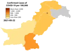 The COVID-19 pandemic in Pakistan is part of the pandemic of coronavirus disease 2019 (COVID-19) caused by severe acute respiratory syndrome coronavirus 2 (SARS-CoV-2). The virus was confirmed to have reached Pakistan on 26 February 2020, when two cases were recorded (a student in Karachi who had just returned from Iran and another person in the Islamabad Capital Territory).[81] On 18 March 2020, cases had been registered in all four provinces, the two autonomous territories, and Islamabad Capital Territory,[82] and by 17 June, each district in Pakistan had recorded at least one confirmed case of COVID-19.