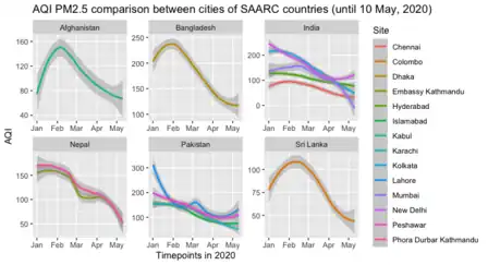 The impact of mobility decrease was likewise seen noticeable in air-quality record [109] (in view of particulate issue size 2.5 micrometers, otherwise called AQI PM2.5). Aside from the Bhutan and Maldives, all nations in SAARC have day by day records of PM2.5 (as announced in airnow.gov) which has been imagined in figure 4 from mid 2020 until May 10 for all urban areas for which the information is accessible in SAARC. Afghanistan, Bangladesh, and Sri Lanka indicated an expansion of AQI PM2.5 esteem in mid 2020 that crested in mid February, and afterward reliably declined until May. In every single other nation, a consistent diminishing has been seen in these five months. Since a huge extent of PM2.5 can be credited to traffic vehicle's gas and mechanical consuming of fills, this overall decrease of AQI information by implication shows an impact of lockdown in these nations.