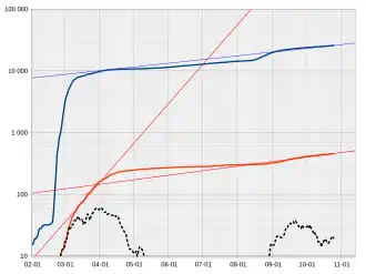 South Korea introduced what was considered one of the largest and best-organised epidemic control programs in the world, along with Singapore, Taiwan, and Vietnam.[11][12][13] Various measures were taken to mass test the population for the virus, and isolate any infected people as well as trace and quarantine those they had contact with, without any further lockdown.[14][15] The rapid and extensive testing undertaken by South Korea has been judged successful in limiting the spread of the outbreak, without using the drastic measure of locking down entire cities.[14][16][17] Despite these successful measures, however, a significant rise in the number of new infections occurred beginning in August 2020, with clusters being linked to Protestant churches in the Seoul Metropolitan Area.[18][19] Another rise began in the third week of November, and Seoul has since entered a third wave of infections.[20] On 24 November, the government raised the social distancing level in Seoul to level 2.[21] On 29 November, the social distancing level in other areas of the country was raised to 1.5.[22] In December, it was raised to level 2.5 in some metropolitan areas and 2 in other areas.[23]