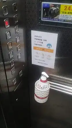 ![]() From top to bottom then from left to right: a queue in front of a pharmacy in Wonju for the distribution of masks, a drone of disinfection in Seongnam, a closed elementary school in Daegu, protest inscriptions against Shincheonji on a car, video call between members of the South Korean government, manufacturing of masks in Busan, 2020 South Korean legislative election, admission of a symptomatic patient to a hospital in Busan, portable medical negative pressure isolation stretcher in a fire station in Hoengseong County, firefighters' training in Daegu, thermal camera at the entrance to Wonju hospital, temperature check at Incheon International Airport, drive-through testing in Gyeongju. | |