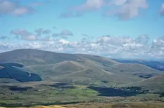 The usual route of ascent is from the A713 road to the west at the "Green Well of Scotland" one mile (1.5 kilometres) north of Carsphairn.[4] Despite its height, it is a relatively easy hill to climb – over some rough grass, with no steep slopes and with a very flat summit area – though there are areas of more rugged ground on the outlying peaks of Beninner and Moorbrock. For most of the route, there are excellent views westward over the Glenkens[5] to the Rhinns of Kells in the Galloway Hills. According to a tourist information board placed at The Green Well at the start of the track, in good conditions, the mountains of England, Wales, Ireland and the Highlands of Scotland can be seen from the summit, as well as Glasgow and Edinburgh, some 80 miles (130 kilometres) distant.