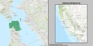 Currently, the 12th district is located in Alameda County and includes the cities of Oakland, Berkeley, Emeryville, Alameda, Albany, Piedmont, and most of San Leandro. With a Cook Partisan Voter Index rating of D+39, the 12th district is the most Democratic district in California, giving nearly 90% of its vote to Democrats in both the 2016 and 2020 presidential elections.[1][2]