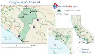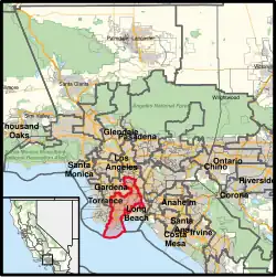 The congressional district is located in the southern portion of the state and includes part of Los Angeles County.[3] The district's current borders are delineated by the 110 freeway in its western border and takes an inward right following the 105 Freeway. Following S. Central Avenue north, it then zig-zags its way to Florence Ave at its apex. Its eastern border runs mostly along the 710 Freeway until reaching the Pacific Ocean.