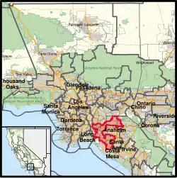 The district is based in Orange and Los Angeles counties and includes all of Garden Grove, Westminster, Cerritos, Buena Park, Placentia, Hawaiian Gardens, Cypress, Fountain Valley, Artesia, Los Alamitos, Rossmoor, and La Palma, as well as parts of Brea, Lakewood, and Fullerton.