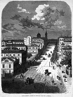 Despite the impending urbanisation of the neighborhood of Argüelles, during the Sexenio Democrático the works of the leveling to link the streets of Leganitos and Duque de Osuna and Princesa were halted.[4] During this period the street was named Olózaga after the progressive mayor of Madrid Salustiano de Olózaga.[5] The street was part of the route of the first tram in the city, operated by The Madrid Street Tramway Co. Ltd., inaugurated in 1871.[6] A sculpture of Agustín Argüelles was inaugurated at the junction of Princesa with Marqués de Urquijo in 1902.[7]