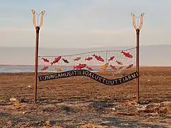 Situated between Dease Strait[38] and Queen Maud Gulf[26] on the southeast coast of Victoria Island (Kitlineq[39]), part of the Arctic Archipelago,[40] Cambridge Bay is a transportation and administrative centre for the Kitikmeot Region.[41] To the north of the community is Tahiryuaq (also spelt Tahikyoak and formerly Ferguson Lake)[42] which flows into Wellington Bay via the Ekalluk River. The Ekalluk River is both an important commercial fishing and archaeological area,[43] and of particular importance is the short section of the river known as Iqaluktuuq.[23]
