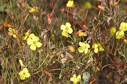 It is an annual plant growing to 5–25 cm tall (rarely to 50 cm tall). The leaves are linear, 0.5–3 cm long, with a finely serrated margin. The flowers have four petals 5–15 mm long, yellow with a red spot at the base, fading orange to reddish.