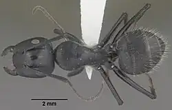 Camponotus laevissimus (formerly C. laevigatus), the giant carpenter ant, is a species of carpenter ant native to western Canada, the United States, and Mexico.[2][1] Workers measure between 7 and 13 millimetres (0.28 and 0.51 in) in length. It is generally shiny black with a blue tint,[3] and the body is covered in short white hairs.[3] The species, which is primarily diurnal,[3] tends to make its nests by hollowing out redwoods.[4] It feeds on the pupae of the western spruce budworm.[5]