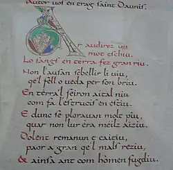 The language or dialect of the poem is also debated, since on it hinge the nationalist pride of Catalonia and the thesis that Catalan and Occitan, the language of southern France, were indistinct before the fourteenth century. Ernst Hoepffner (1926) argued that it was "certainly not Catalan".[5] Martín de Riquer (1964) agrees that "one cannot affirm the Catalanity of this beautiful and ingenious poem indubitably".[6] Aurelio Roncaglia (1961) suggests it was written in the lingua d'oc (Occitan) but ai margini della Catalogna (on the margins of Catalonia).[5] As early as 1581 Claude Fauchet believed it was vieil espagnol, pour le moins cathalan (old Spanish, at least Catalan), but the manuscript Fauchet worked from disappeared.[7]