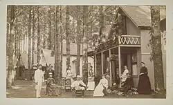 Following a wave of Methodism sweeping through regions of New York and New England, the Pine Grove campground became a mecca for faithful pilgrims.[5] It began in the summer of 1860, when the Poughkeepsie district of the Church held a modest week-long camping retreat, in which attendees pitched tents on what was then rented picnic grounds. However, attendance grew steadily in the years following its official establishment in 1871. By the late 1870s-early 1880s, there were as many as 10,000 guests at Pine Grove, coming from as far away as Hartford, New Haven and New York City.[1] A seasonal railroad station on the Housatonic R.R. was established to facilitate travel for the high volume of visitors.[6] By this time, an ample collection of Victorian cottages had been built on the property, along with a lodging house, called the Mountain View Inn.[7]