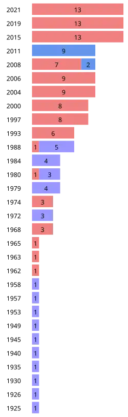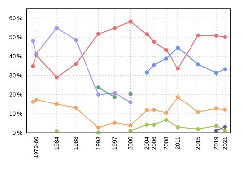 | Election | Liberal | Conservative | New Democratic | Green | People's | PC | Reform / Alliance |