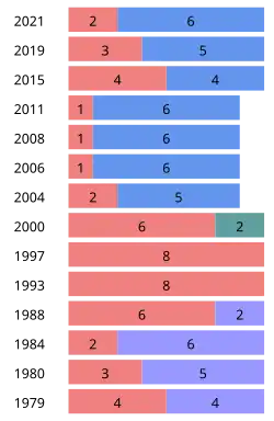 | Election | Liberal | Conservative | New Democratic | Green | People's | PC | Reform / Alliance |