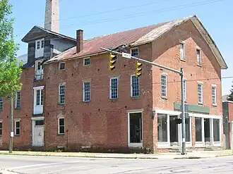 The Canal Warehouse is a historic warehouse at the intersection of Main and Mulberry Streets in downtown Chillicothe, Ohio, United States. Built in 1830,[1] along the Ohio and Erie Canal, this three-story brick building is an ornate gabled structure with large dormers set into both sides of the main roof. These dormers served a purpose far different from decoration: their windows connect with first-floor doors to enable longshoremen easily to move goods into or out of the third floor. On the ground level, individuals can enter the warehouse through either of two recessed doorways; three stone steps climb from the sidewalk to each doorway.[2]