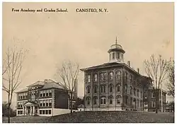Canisteo Academy was the second high school, at the time called academies, in Steuben County (the first was the long-vanished Addison Academy). It came into legal existence in 1868, and obtained funding to build a brick building on Greenwood Street, which opened in 1871.[13] There was no similar school in Hornellsville (Hornell), Bath, or Corning; in Hornellsville none appears in the records until St. Ann's Academic School, in 1894.[14]: 94  To reach another academy from Canisteo one had to go 15 miles (24 km) northwest, to Alfred, New York, in Allegheny County. The Addison Academy was 27 miles (43 km) to the southeast.