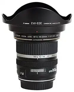 The Canon EF-S 10–22mm f/3.5–4.5 USM lens is a wide to ultra-wide angle zoom lens for Canon digital single-lens reflex cameras with a Canon EF-S lens mount.[1] The field of view has a 35 mm equivalent focal length of 16–35mm, which is analogous to the EF 16–35mm f/2.8L on a full-frame camera. The 10–22mm is an internal focusing lens. Of the 13 elements, one is of Canon's Super Ultra-Low Dispersion glass and three are aspherical elements.