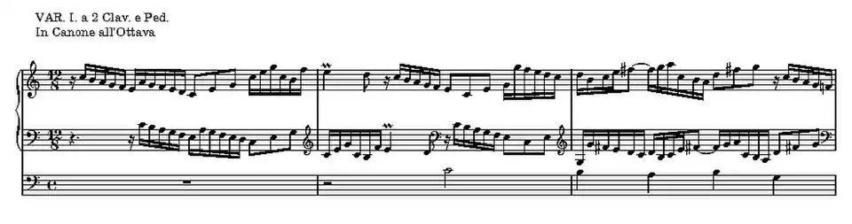 In this variation, the canon is the melody of the chorale itself. It has three sections, the first and second further subdivided in two, building up to a majestic and complex climax in the final bars of the third section. In the first section, the two manual parts play the chorale line by line in inverted canon over a walking bass continuo stamped out in the pedal, first at an interval of sixth and then a third. In the second and third sections, the pedal part returns to the smooth lines of the cantus firmus.[30][31]