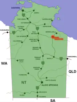Cape Crawford is a location in the Northern Territory in Australia. It is 100 kilometres south-west of Borroloola and is surrounded by savannah woodland, rock escarpments, waterfalls and waterholes. From here it is possible to organise a helicopter ride over the 'lost city' (large sandstone outcrops and formations formed 1.4 billion years ago) of the Limmen National Park. There is also an airport nearby called Cape Crawford Airport.