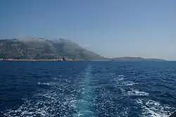 The Cape of Gjuhëz (Albanian: Kepi i Gjuhëzës) is a rocky cape northwest of Karaburun Peninsula as well as the westernmost point of continental Albania. It projects 1.1 kilometres (0.68 mi) into the sea in the form of the tongue, thus the origin of its name. The altitudes of the cape slope gradually towards the water, whereas the southern shores form 30 to 40 metres (98 to 131 ft) high steep cliffs that fall directly to the Ionian Sea. The cape lacks vegetation, while limestone rocks, highly eroded by Karst are spread over whole the area.[2][3]