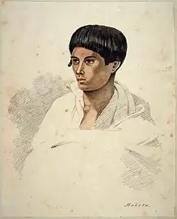 At the first execution, on 7 March 1842, approximately a thousand people gathered at the corner of Queen Street and Victoria Street West, now the centre of the Auckland CBD, to witness the hanging of Wiremu Kīngi Maketū.[14] He had been found guilty of murdering five people on Motuarohia Island, in the Bay of Islands.[6] The people killed were Thomas Bull, employed by Elisabeth Roberton, who was also murdered along with her son aged eight, her daughter of two, and a girl of nearly three named Isabella Brind, the natural daughter of one Captain Brind by a Māori woman, the daughter of Rewa, chief of Ngapuhi in that area. Mrs Roberton's husband, Captain John Roberton, had drowned prior in Paroa Bay, just opposite the island. Thomas Bull had a reputation for strength and brutality. He seemed at all times to have made a set at Maketū and had on several occasions struck, thrown, or otherwise maltreated him. Maketū was unable to defend himself against such an opponent; nor indeed did it conform with his notions of dignity to do so, he being (by virtue of his chiefly rank) above combat with one who was a servant and whom he therefore regarded on the same plane as a slave. Maketū, therefore, bided his time for revenge. Maketū then killed Thomas Bull in the night with an axe; he then brutally murdered Mrs Roberton, who was shouting abuse at him and then went to murder the two girls (ransacking the house and then burning Mrs Roberton and the two children within it). The boy ran up Pa Hill, where Maketū chased him and threw him off the 200-foot (60 m) cliff. He was sentenced to death by an all-white jury (his defence had wanted a half-white, half-Māori jury) in an Auckland court, and executed on 7 March 1842.[15]