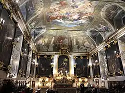The altar dates back to 1797 and is the work of Michele Emanuele Buscaglione. On either side there are two reliquaries, while on the wall there are three paintings by the Jesuit painter Andrea Pozzo: Nativity with shepherds (1699 circa), Adoration of the Magi (before 1694), and Flight to Egypt (around 1699). The baroque frescoed ceiling by Legnanino depicts Heaven, prophets, sibyls and biblical episodes and dates to 1694-1695. The organ on the wall opposite the altar dates back to the eighteenth century.