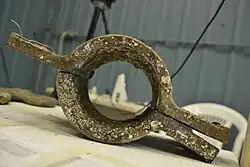 In artillery, capsquares, or capsquires, are strong plates of iron which come over the trunnions of a cannon, keeping it in its carriage. They are fastened by hinges to the paizeplate, so that it could be lifted up and down. They form a part of an arch in the middle, to receive a third part of the thickness of the trunnions; for two thirds of them are let into the carriage, and the other end is fastened by two iron wedges, which are called the forelocks, and keys.