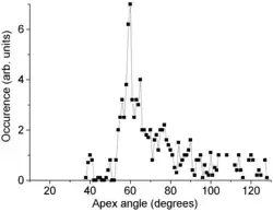 Carbon cones have also been observed, since 1968 or even earlier,[8] on the surface of naturally occurring graphite. Their bases are attached to the graphite and their height varies between less than 1 and 40 micrometers. Their walls are often curved and are less regular than those of the laboratory-made nanocones. The distribution of their apex angle also shows a strong feature at 60°, but other expected peaks, at 20° and 40°, are much weaker, and the distribution is somewhat broader for large angles. This difference is attributed to the different wall structure of the natural cones. Those walls are relatively irregular and contain numerous line defects (positive-wedge disclinations). This breaks down the angular requirement for a seamless cone and therefore broadens the angular distribution.[7]