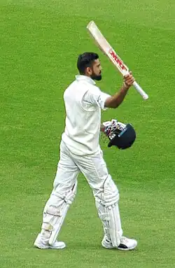 Kohli carried on his form with ODI centuries against the West Indies and Sri Lanka in consecutive series, equaling Ricky Ponting's tally of 30 ODI centuries.[180][181] In October 2017, he was adjudged the ODI player of the series against New Zealand for scoring two ODI centuries, during the course of which he made a new record for the most runs (8,888), best average (55.55) and highest number of centuries (31) for any batsman when completing 200 ODIs.[182][183] Kohli made several more records during the 3 match Test series against Sri Lanka at home in November. After scoring a century and a double century in the first two Tests, he ended up scoring yet another double century in the third Test during which he became the eleventh Indian batsman to surpass 5000 runs in Test cricket while scoring his 20th Test century and 6th double century.[184] During this match he also became the first batsman to score six double hundreds as a captain.[185] With 610 runs in the series, Kohli also became the highest run-scorer by an Indian in a three-match Test series and the fourth-highest overall.[186] India comfortably won the three-match series 1–0 and Kohli was adjudged man of the match for the second and third Test matches and player of the series. With this win, India equaled Australia for the record streak of nine consecutive series wins in Test cricket.[187] He ended the year with 2818 international runs, which is recorded as the third-highest tally ever in a calendar year and the highest tally ever by an Indian player.[186] The ICC named Kohli as captain of both their World Test XI and ODI XI for 2017.[188] Kohli farely averaged in the Test matches as India lost 1–2 during the South Africa tour in 2018 but came back strongly to score 558 runs in the 6 ODIs making a record for the highest runs scored in a bilateral ODI series.[189] This included three centuries, remaining unbeaten in two with a best of 160*.[190] India won the ODI series 5–1 and Kohli became the first Indian captain to win an ODI series in South Africa.[191]