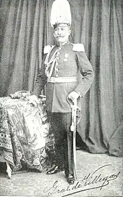 The son of General Carlos de Villegas and Belizenda Constanza Ribera, Villegas was born in the city of La Paz on December 25, 1862. At the age of 17, he obtained a bachelor's degree in Letters, Philosophy, and Humanities in 1877. Two years later, the War of the Pacific ignited. Villegas decided to join the army and enlisted in the ranks of the "Chorolque" battalion in Potosí, part of the Fifth Division, which left Cotagaita on October 11, 1879, under the command of General Narciso Campero. Promoted to sublieutenant standard-bearer on May 2, 1880, he had his baptism of fire in the Battle of el Alto de la Alianza, where he fought until he was seriously wounded and captured. Taken prisoner and interned in the Chilean town of San Bernardo, he remained captive until the end of 1881, when he was able to return to his homeland, promoted to first lieutenant on October 20, 1883.[1][2]