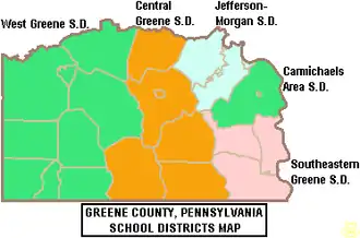 The Carmichaels Area School District serves the Borough of Carmichaels and Cumberland Township in Greene County, Pennsylvania. The district encompasses approximately 39 square miles (100 km2). The district is one of the 500 public school districts of Pennsylvania and one of five public school districts in Greene County. According to 2000 federal census data, it served a resident population of 7,120. By 2010, the district's population declined to 7,098 people.[1] In 2009, the district residents’ per capita income was $15,269, while the median family income was $36,276.[2] In the Commonwealth, the median family income was $49,501[3] and the United States median family income was $49,445, in 2010.[4] The educational attainment levels for the population 25 and over were 86.0% high school graduates and 18.6% college graduates.[5]