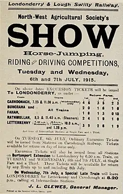 12. ^ "LONDONDERRY & LOUGH SWILLY AND LETTERKENNY RAILWAYS AND CARNDONAGH EXTENSION. CHEAP EXCURSIONS". Derry Journal. 8 September 1901.