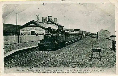The station opened on 1 July 1901. The Londonderry and Lough Swilly Railway provided passenger services and goods transportation from their Londonderry Graving Dock station to Buncrana and northwards to Clonmany, Ballyliffin and Carndonagh. When the Carndonagh Extension was opened, there were seven weekday trains to Buncrana, of which the 6.30 and 11.50 a.m. and 4.30 p.m. were extended to the Carndonagh. Two all-station trains ran to Carndonagh and back on Sundays. In 1901, the published timetable anticipated that the journey from Londonderry to Carndonagh would take two hours and ten minutes.[2]
