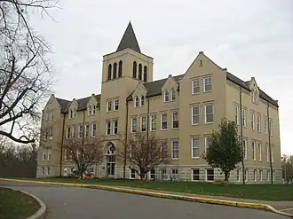 Carnegie Hall of Moores Hill College, also known as Moores Hill High School, is a historic educational building located at Moores Hill, Dearborn County, Indiana. It was built in 1907, and is a 2+12-story, "T"-plan, brick building with Collegiate Gothic and Jacobethan Revival style design elements. It sits on a raised limestone faced basement. The building consists of a central portion flanked by projecting wings bisected by a central bell tower with pyramidal roof. It features a steeply pitched gable roof, parapeted gables, terra cotta trim, and pointed arch openings. The building housed Moores Hill College until 1917, when it moved to Evansville to later become the University of Evansville. It was funded in part by Andrew Carnegie, who donated $18,750 to its construction. It later housed the local high school and elementary school until 1987.[2]: 5–6, 10