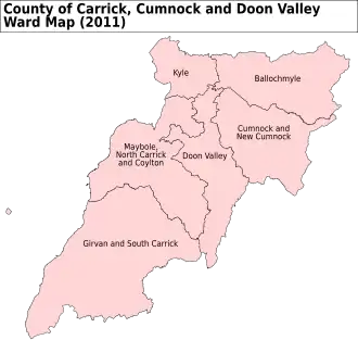 Following their First Periodic review into constituencies to the Scottish Parliament in time for the 2011 Scottish Parliament election, the Boundary Commission for Scotland recommended redrawing the Carrick, Cumnock and Doon Valley constituency. The electoral wards used in the current creation of Carrick, Cumnock and Doon Valley are:[3]