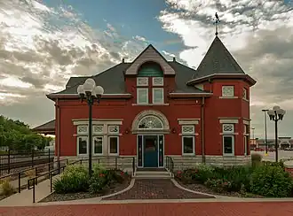 Carroll station is a historic depot building located in Carroll, Iowa, United States. It is an example of a replacement station built along its Iowa mainline by the Chicago and North Western Railway (CNW) in 1896.[2] It replaced a two-story, frame, combination station that was first built in 1867 by its predecessor line, the Cedar Rapids and Missouri River Railroad. That building had experienced two fires. The CNW had built two branch lines from Carroll in 1877 and 1880, which increased business and necessitated a larger depot. The Carroll Express Building was also built across the street for further railroad use. A separate wooden freight house had been built in 1888. Chicago architect Charles Sumner Frost designed this station in the Romanesque Revival style. The baggage room is separated from the depot by a breezeway. Frost designed at least 15 stations for the CNW in Iowa and Nebraska and another 14 in the Chicago area.[2] The building represents the prosperity of the line during the Golden Age of Railroads.