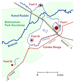Originally, Carska Droga ran along the inner side of the moat of Osowiec Fortress (depicted by a dashed red line),[1][12][17][18] a layout that was altered after 1953 (depicted by a solid line)[1]