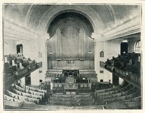 Opus 452 was purchased for the new church, then under construction, in 1911 for $5,395.[2][3] The original organ weighed over 13 short tons (12 t) and its specification was for three manuals, 4 divisions, 29 stops, 27 registers, 29 ranks, 1843 pipes. A Stoplist for the 1911 instrument copied from the factory specifications for Casavant Opus 452 1911 3/29, courtesy of the Casavant Frères Archives, St. Hyacinthe, Québec, Canada is available by following this link: Original Stoplist