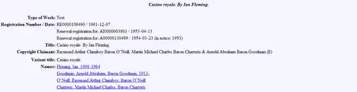In the US three publishers turned the book down before Macmillan Publishing Co offered Fleming a deal.[77] Casino Royale was published on 23 March 1954 in the US, but sales were poor, totalling only 4,000 copies across the entire US during the course of the year.[78] When the novel was released as a US paperback in 1955, it was re-titled by publisher American Popular Library; Fleming's suggestions for a new title, The Double-O Agent and The Deadly Gamble, were disregarded in favour of You Asked for It, but this marketing ploy failed to raise the interest.[79] The Popular Library version also changed Bond's name, calling him "Jimmy Bond".[80]