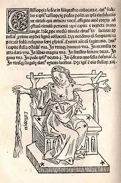 Poseidon's punishment: Cassiopeia as a constellation sitting in the heavens tied to a chair. Hyginus, Poeticon Astronomicon. "U.S. Naval Observatory Library"